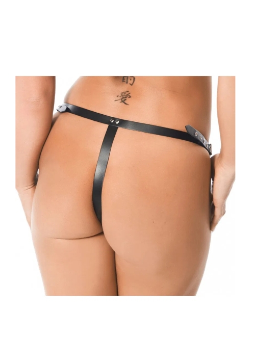 Strap-on hám hasított bőrből, szegecsekkel díszítve. A hám levehető és cserélhető szilikon dildóval rendelkezik (Ø 3,5 x 12 cm).